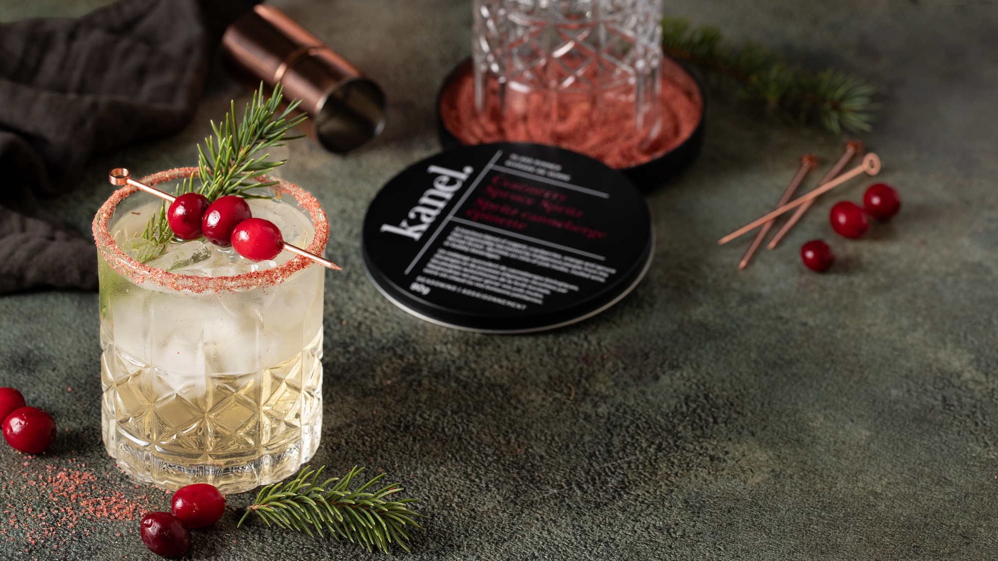- Coat the rim of a glass glass with simple syrup then roll in Cranberry Spruce Spritz.